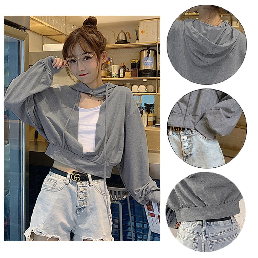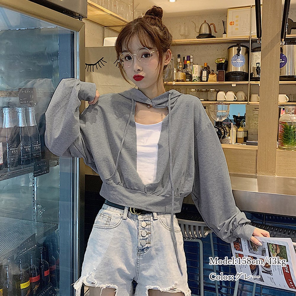 パーカー レディース 韓国風 スウェット ショート丈 胸元あき カットソー お洒落 薄手トップス シンプル
